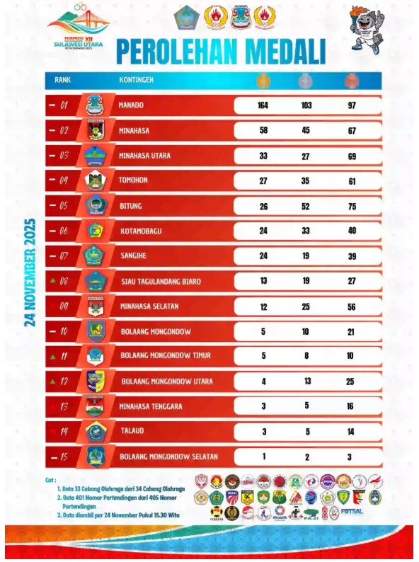 TNews, KOTAMOBAGU – Kontingen Kota Kotamobagu berhasil menutup Pekan Olahraga Provinsi (Porprov) Sulawesi Utara XII tahun 2025 dengan raihan yang membanggakan. Hingga penutupan resmi pada 24 November, kotingen Kotamobagu mengumpulkan total 97 medali, terdiri dari 24 emas, 33 perak, dan 40 perunggu, menempatkan mereka di posisi keenam klasemen umum.